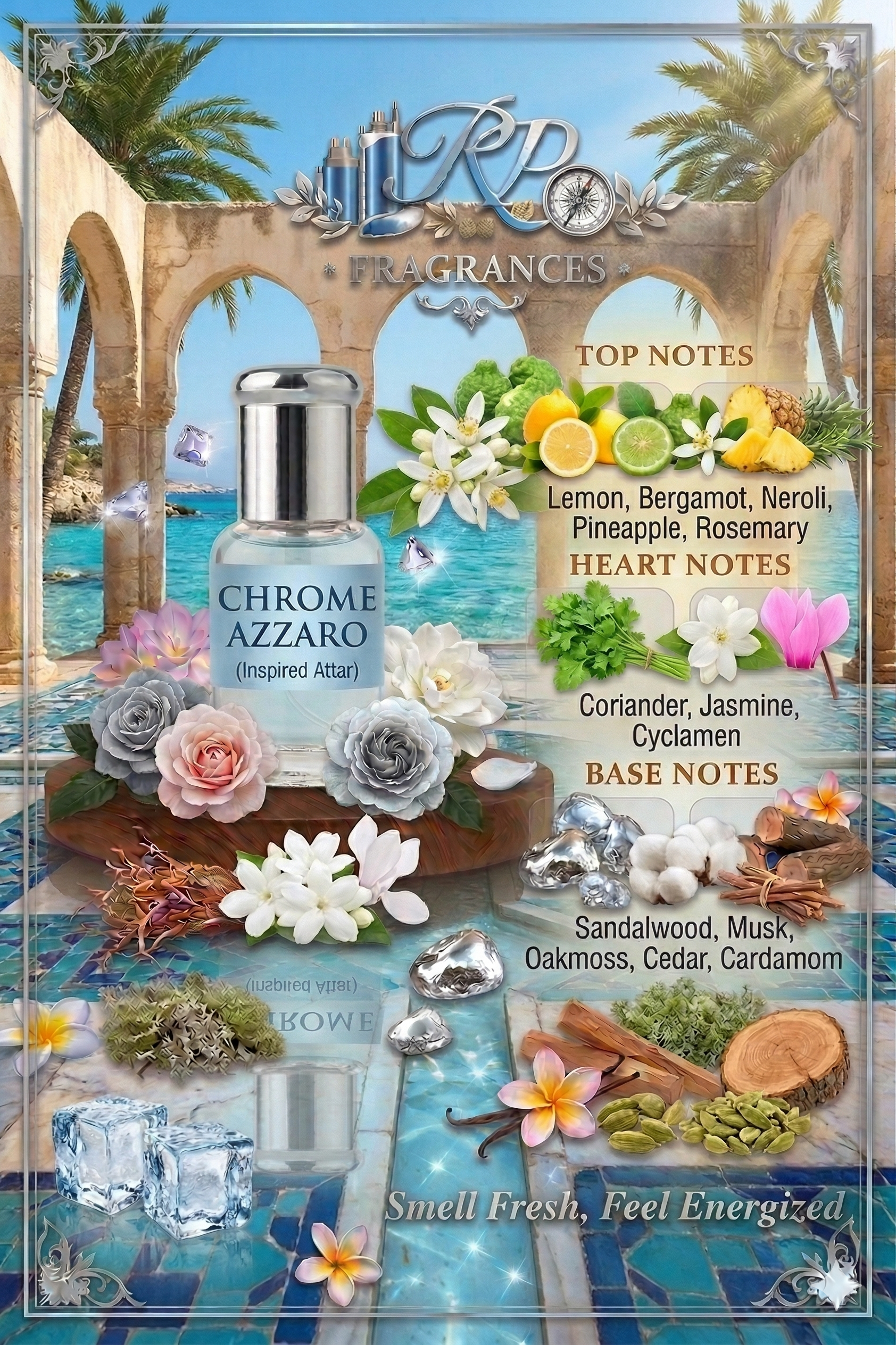 Chrome Azzaro Inspired Attar is a clean, energetic, and refreshing long lasting attar for men, inspired by iconic fresh aquatic fragrances. Designed for modern lifestyles, this premium perfume oil delivers a perfect blend of citrus brightness and aquatic freshness, making it ideal for daily wear.