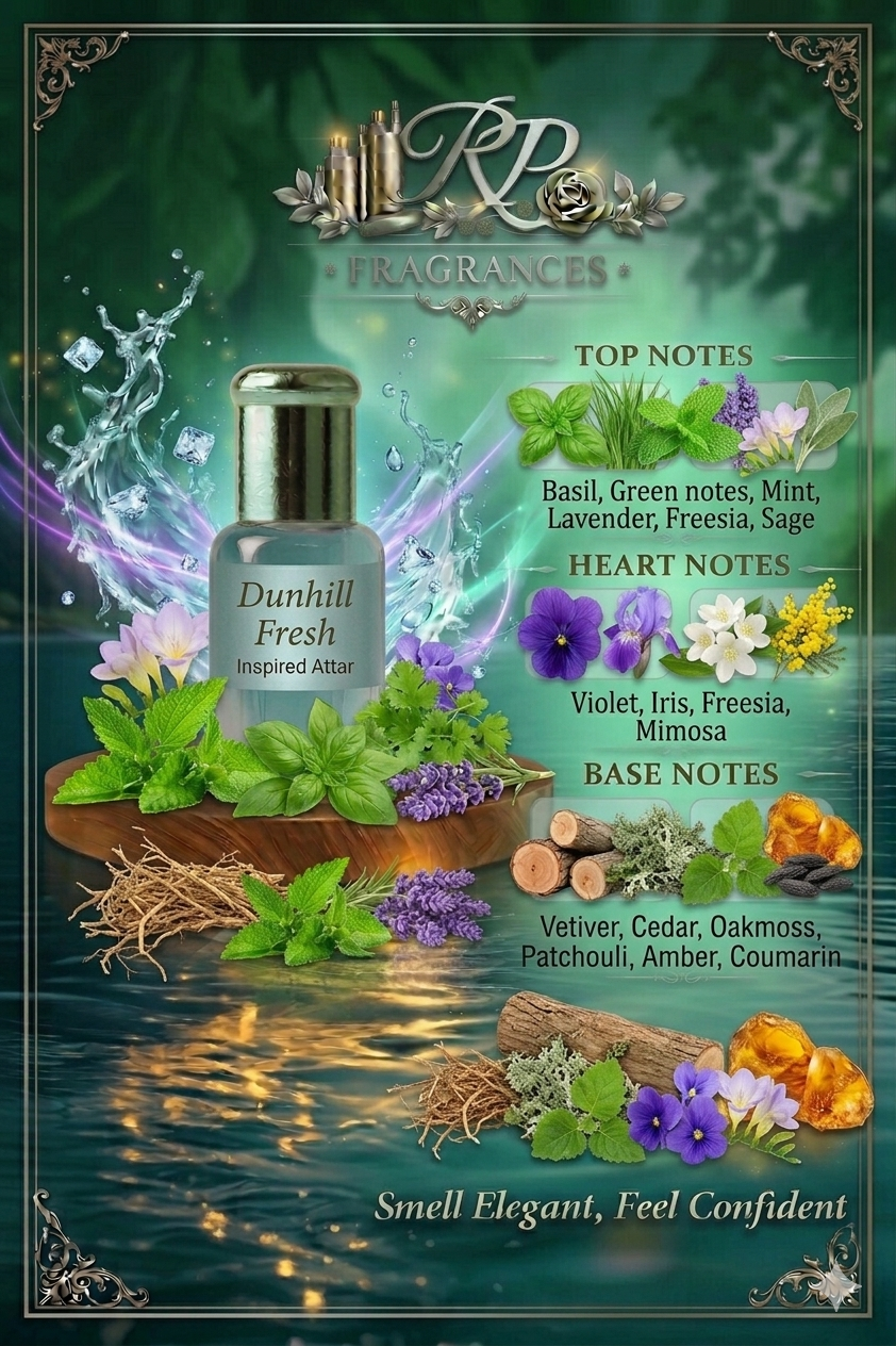 Dunhill Fresh Inspired Attar is a clean, crisp, and invigorating long lasting attar for men, inspired by classic fresh aquatic fragrances. Designed for everyday elegance, this premium perfume oil delivers a refreshing blend of citrus, marine, and woody notes that keep you feeling cool and confident all day long.